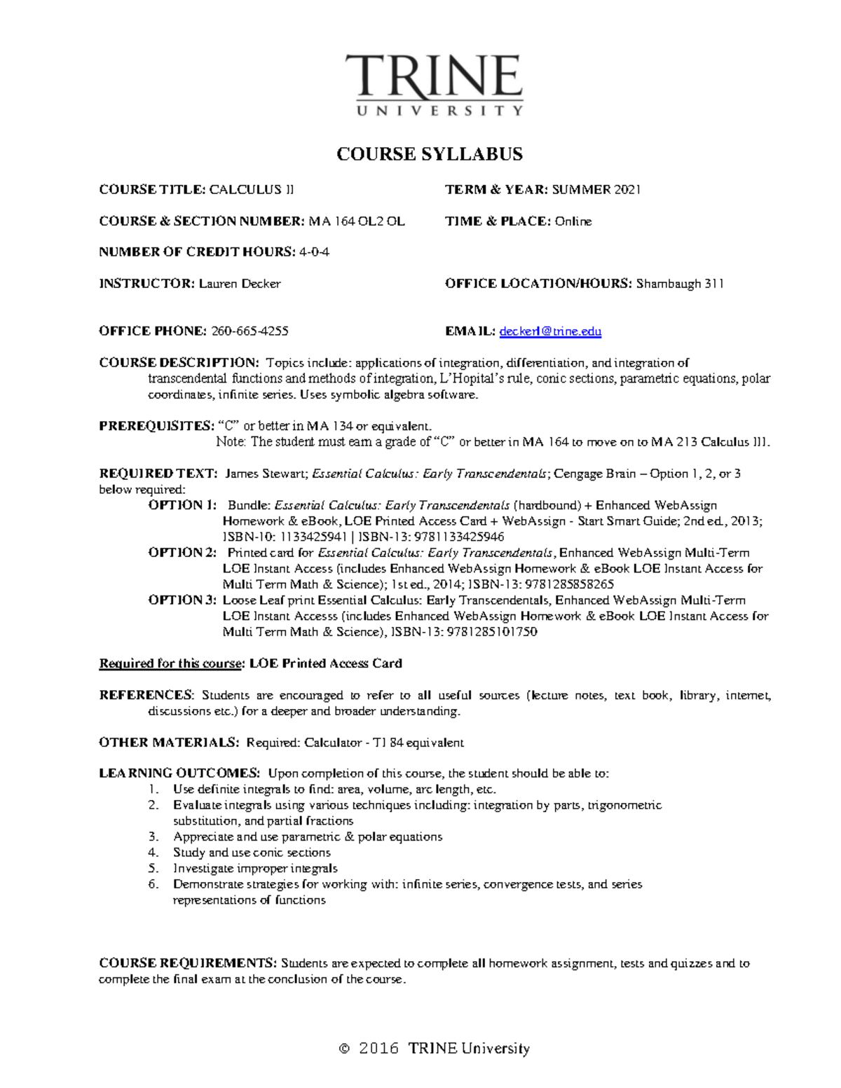 MA 164 Summer 2021 course syllabus © 2016 TRINE University COURSE