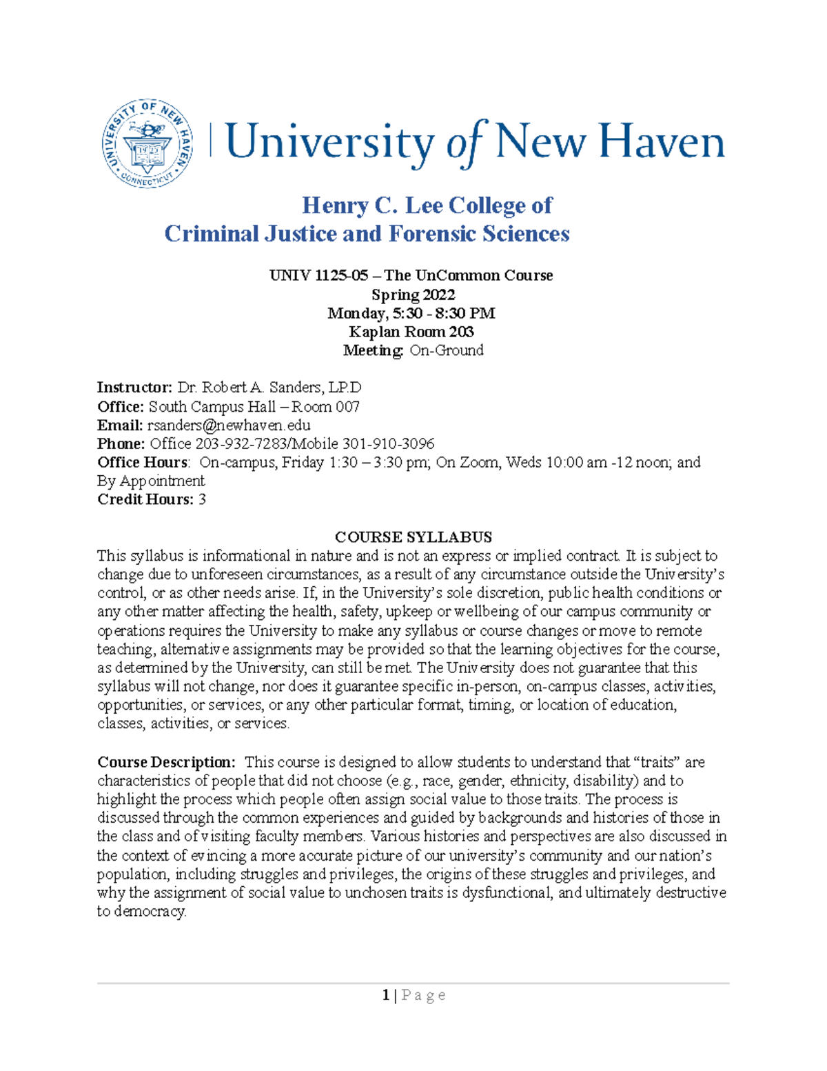 UNIV 112505 Syllabus Spring 2022 (Sanders) Henry C. Lee College of