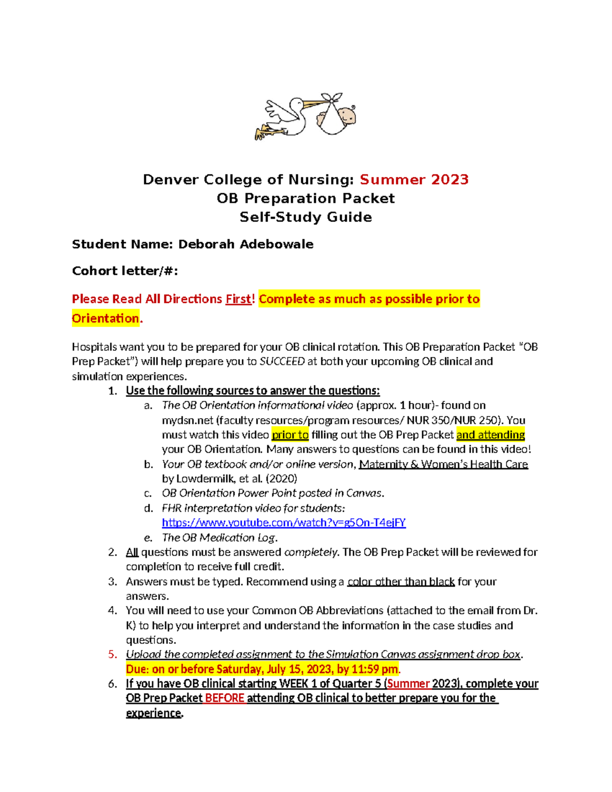 OB Preparation Packet Summer 2023 Denver College of Nursing Summer