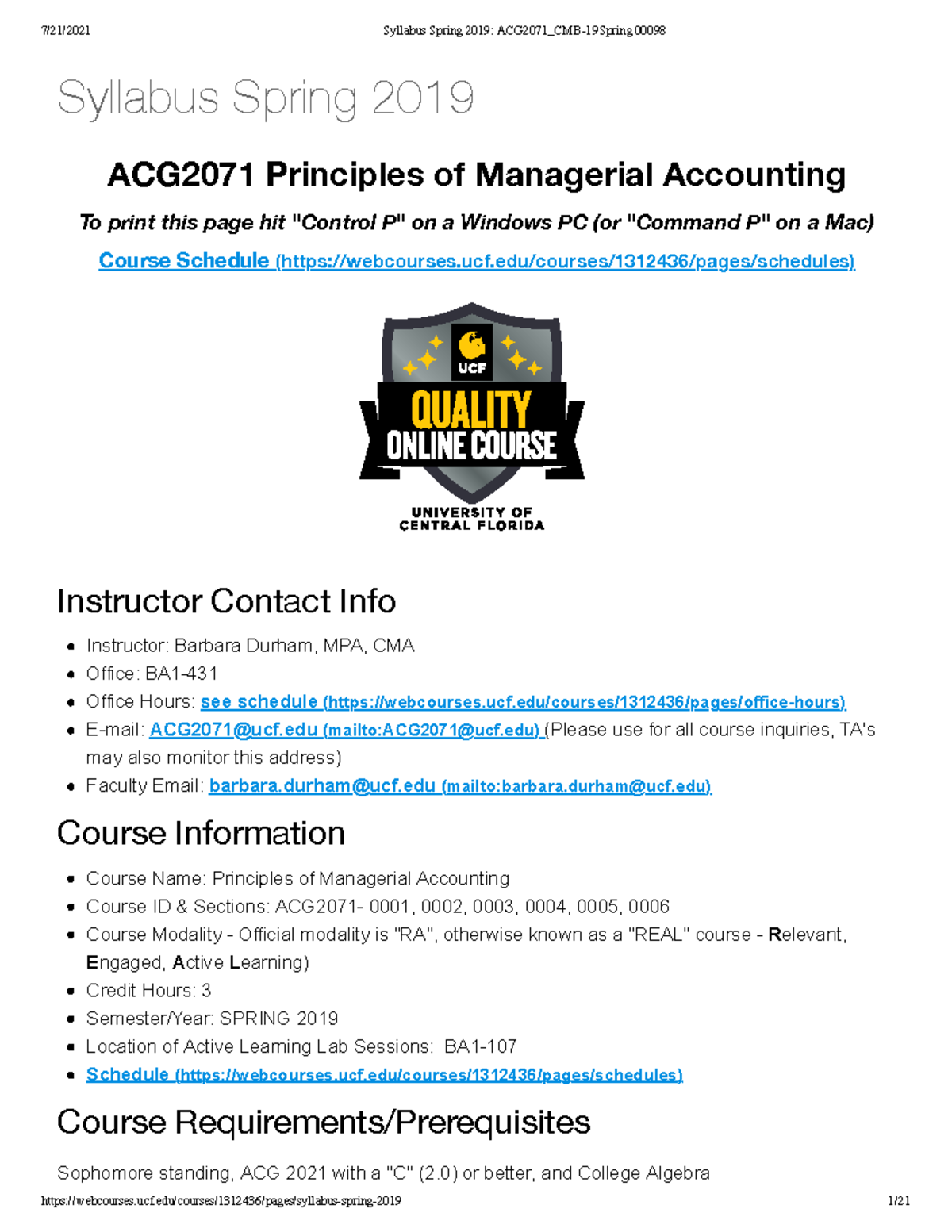 ACG2071 Spring 2019 Syllabus Manegerial Accounting ACG 2071 UCF