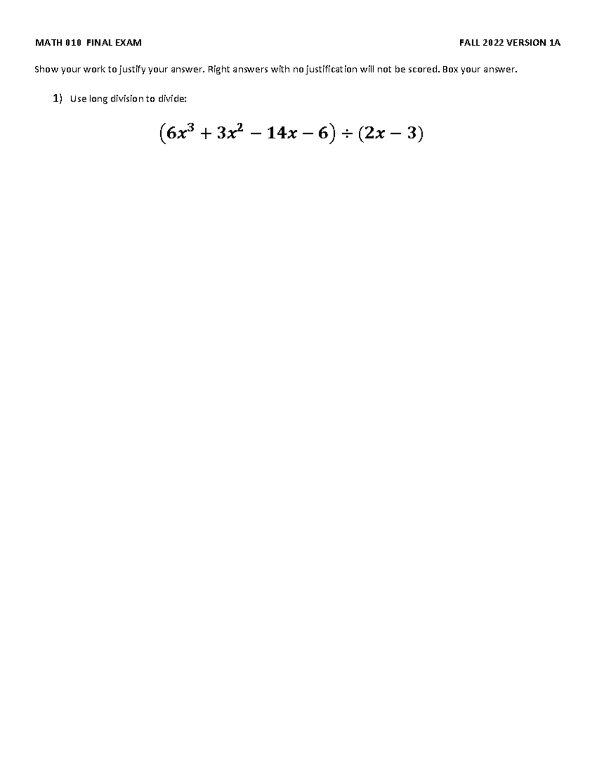 MATH 010 2022 FALL Final Exam Version 1A 14 probs MATH 201 UCSC