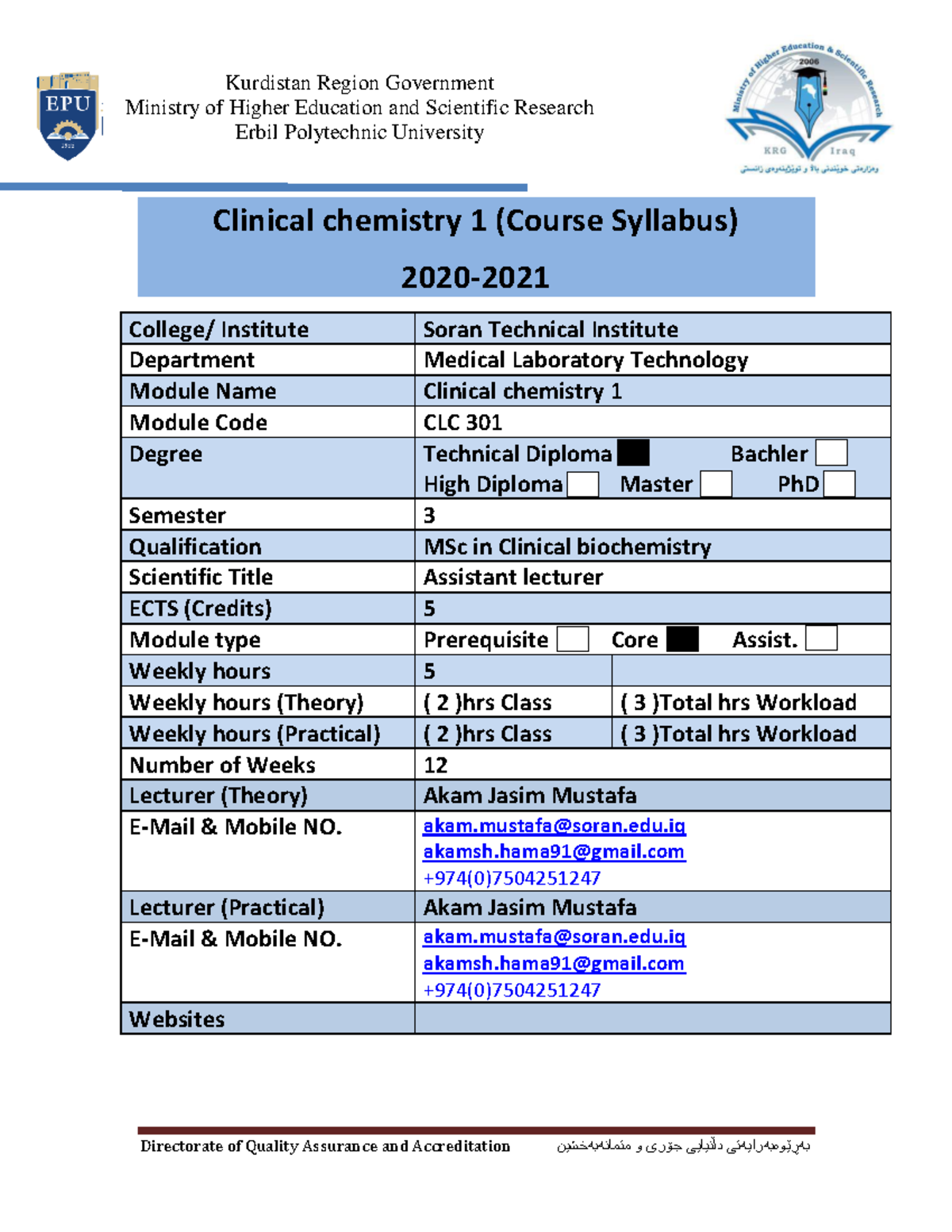 Clinical chemistry I, Course catalouge Clinical chemistry 1 (Course