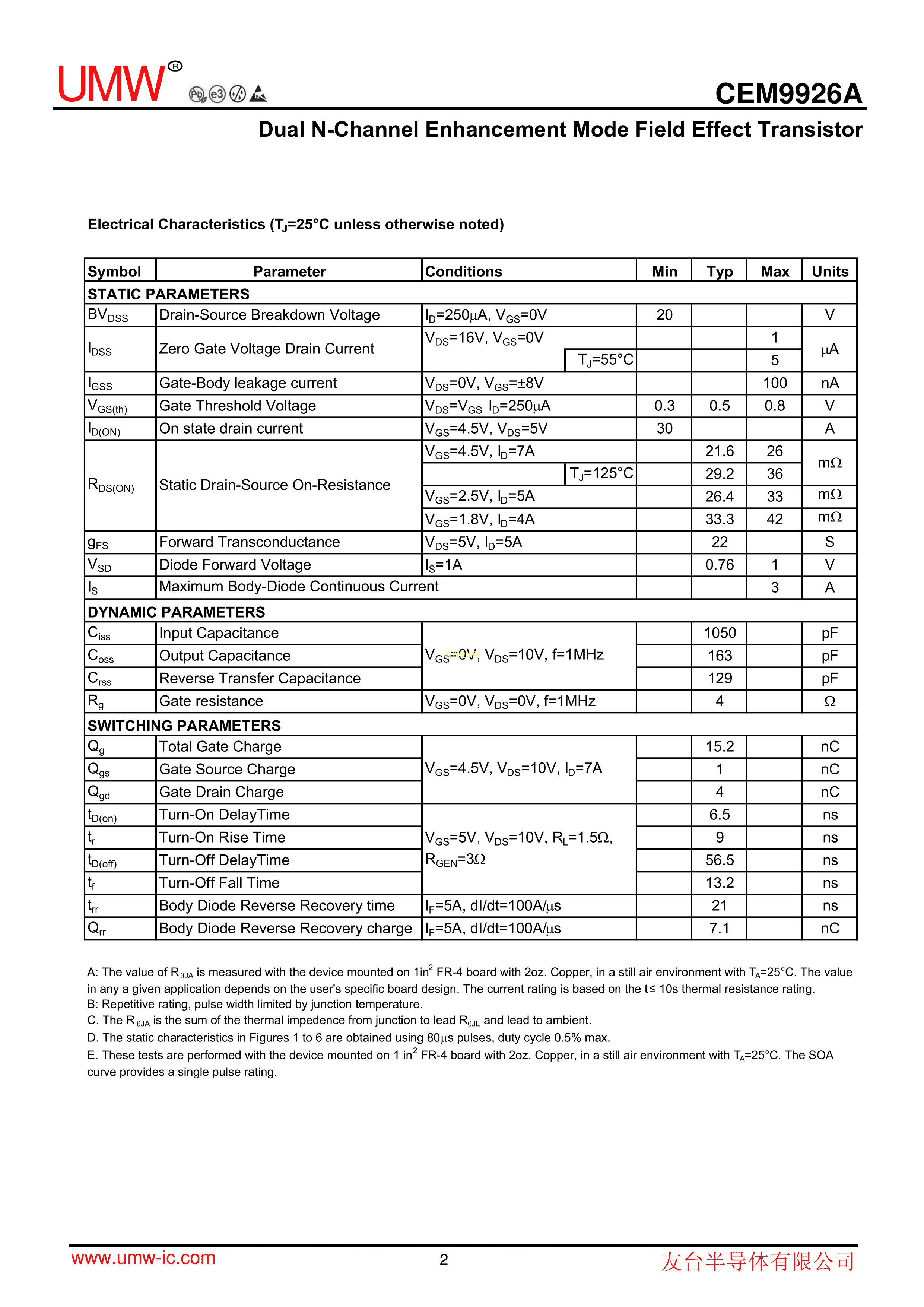 CEM9926A数据手册SOP8封装UMW(友台半导体)PDF规格书,中英文下载 规格书 芯片模块网 让芯片更简单!