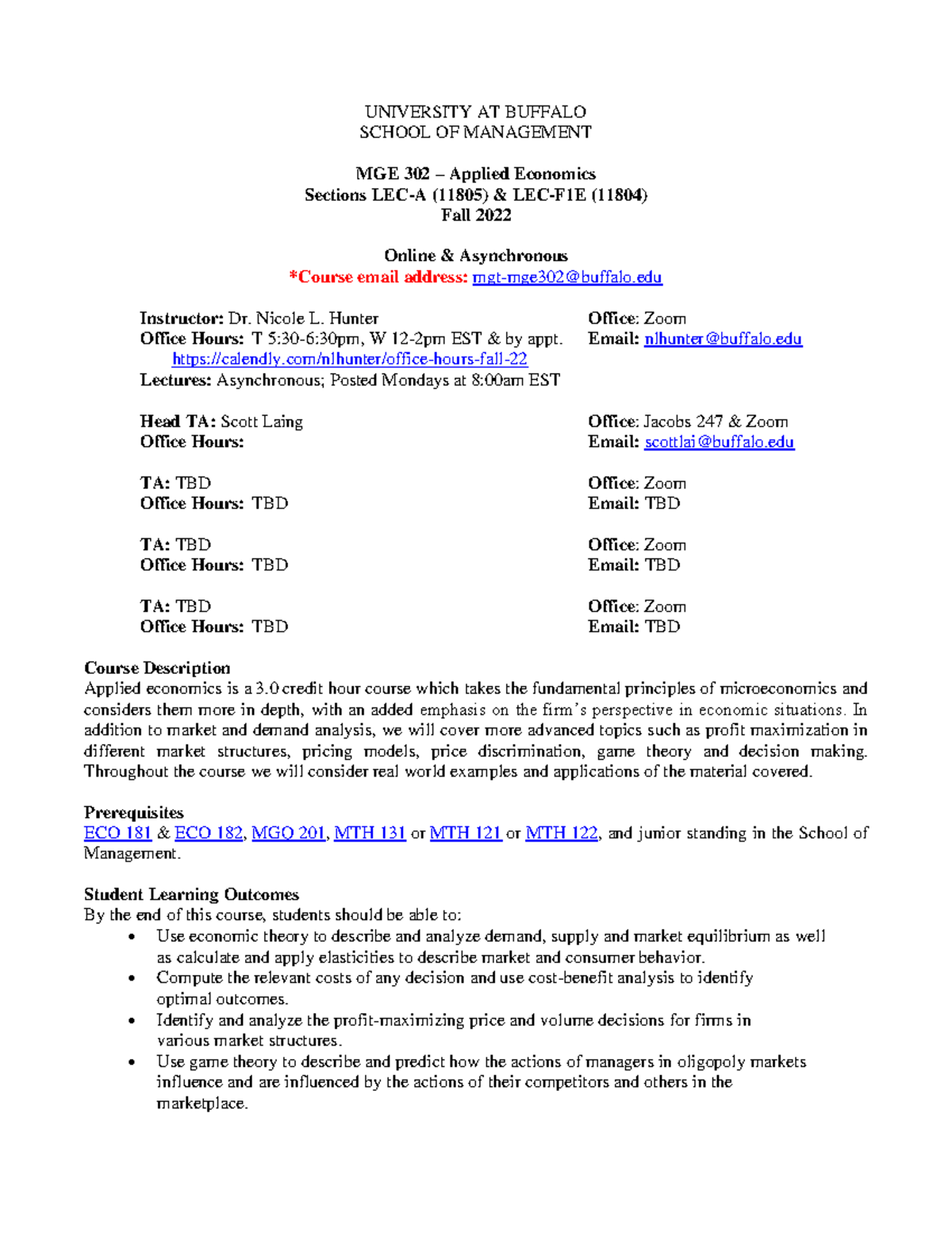 MGE 302 Syllabus UNIVERSITY AT BUFFALO SCHOOL OF MANAGEMENT MGE 302