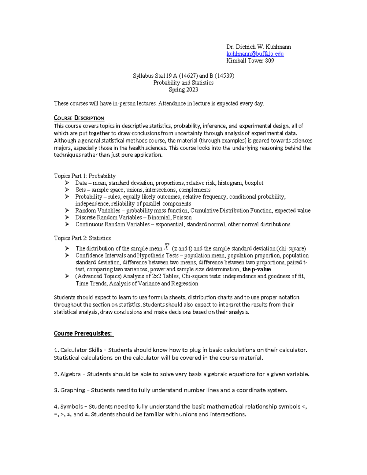 Syllabus STA 119 Spring 2023(1) Dr. Dietrich W. Kuhlmann kuhlmann