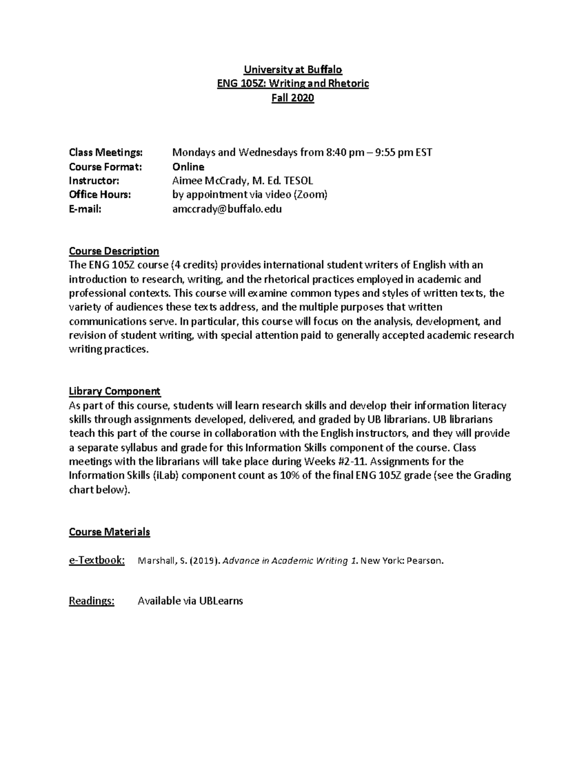 English 105 spring 2021 term syllabus University at Buffalo ENG 105Z