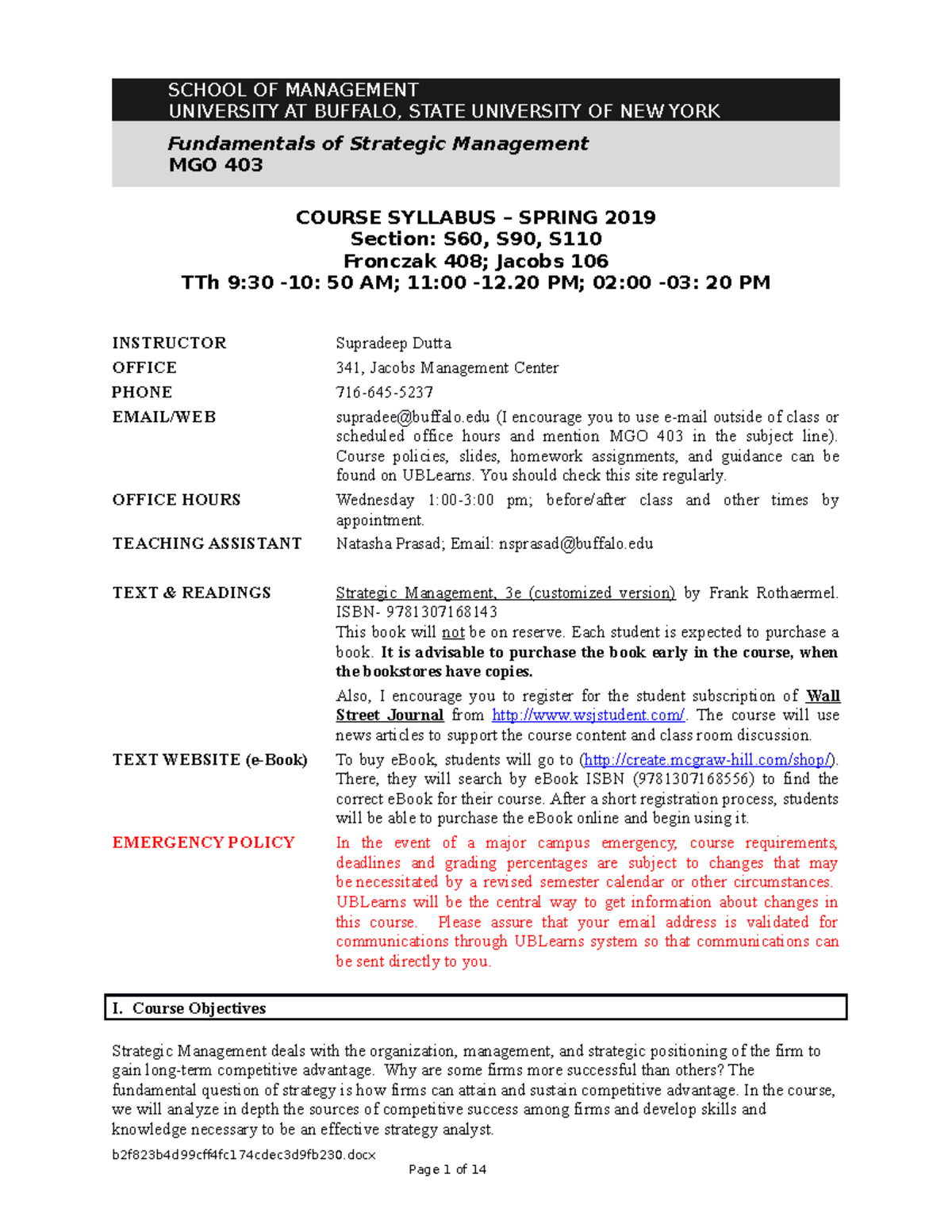 MGO403 syllabus 2019 SCHOOL OF MANAGEMENT UNIVERSITY AT BUFFALO