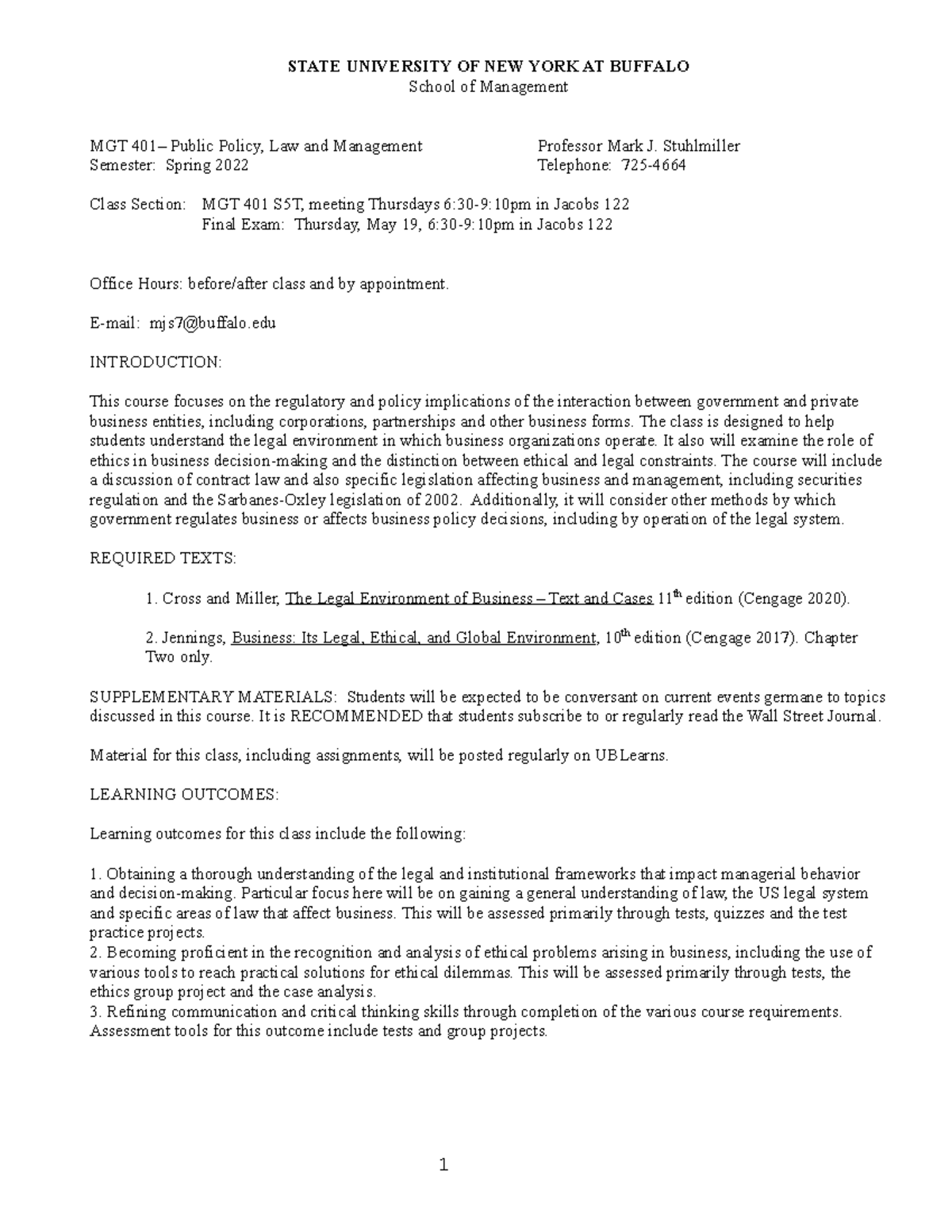 MGT 401 Syllabus Guide STATE UNIVERSITY OF NEW YORK AT BUFFALO School