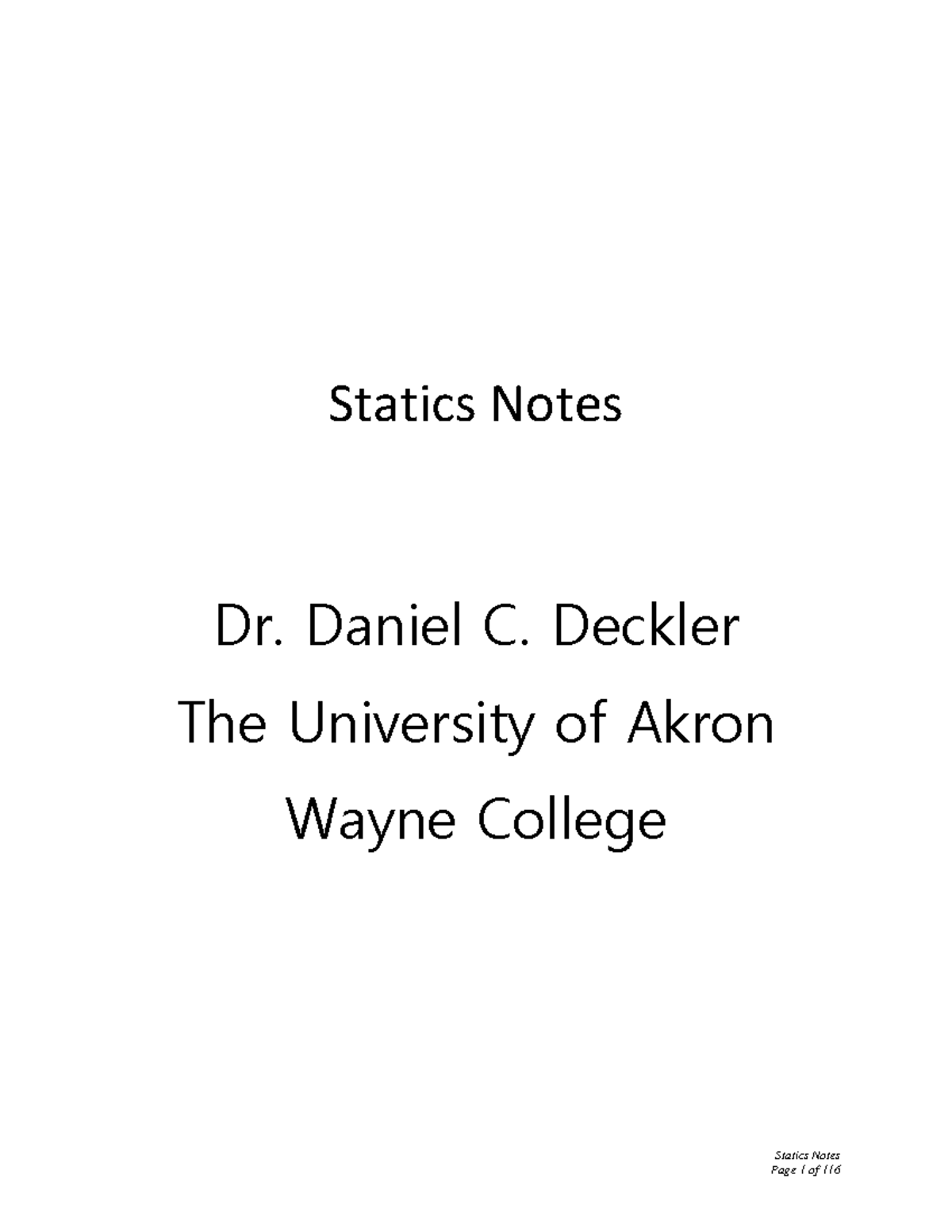 Statics Notes Statics Notes Dr. Daniel C. Deckler The University of