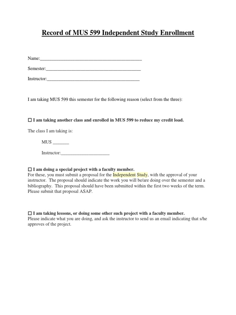 Record of MUS 599 Independent Study Enrollment PDF