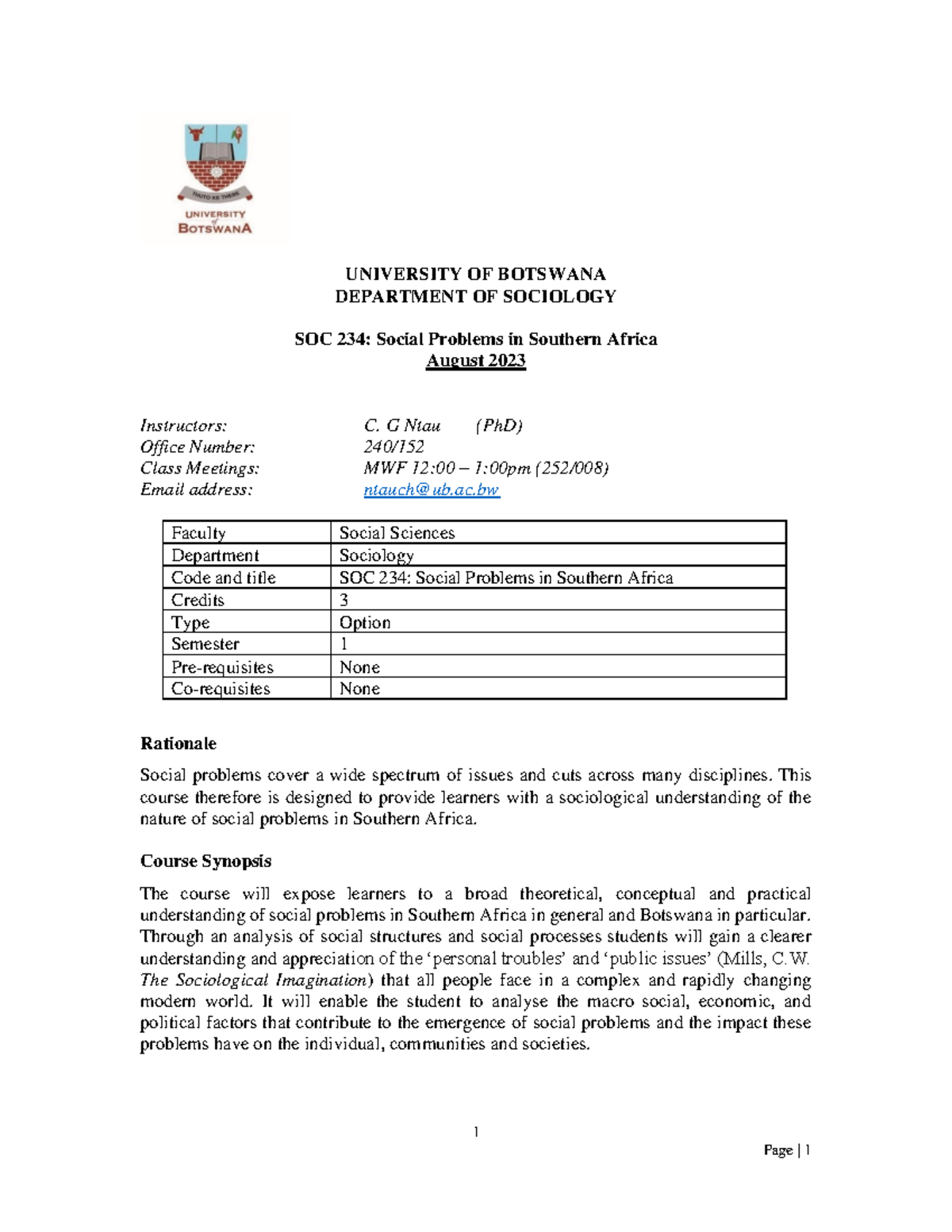 SOC 234 Course Outline (August 2023) 1 UNIVERSITY OF BOTSWANA