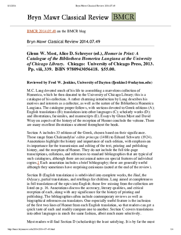 Homer in Print A Catalogue of the Bibliotheca Homerica Langiana at the