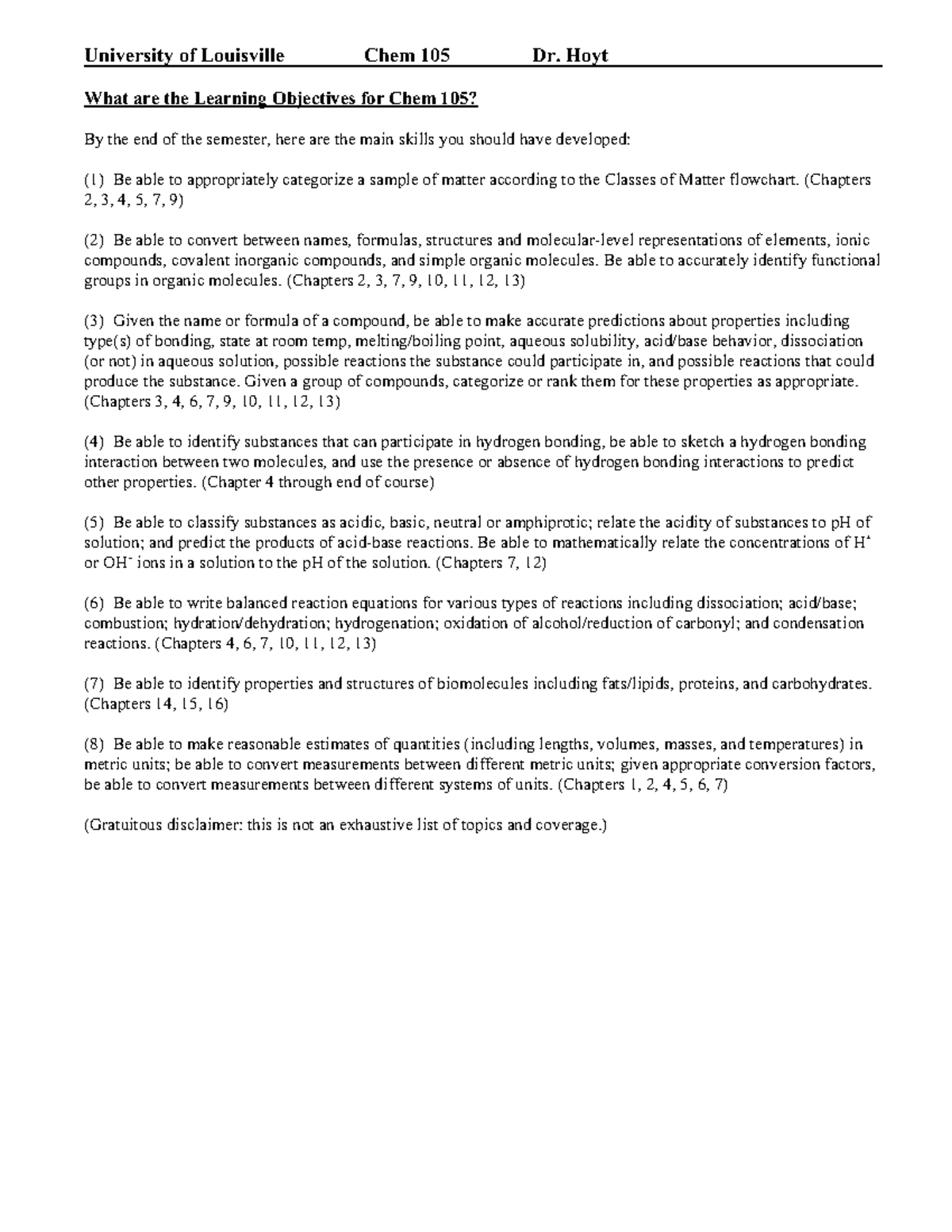 Course LOs Summary of Learning Objectives for Chem 105 University