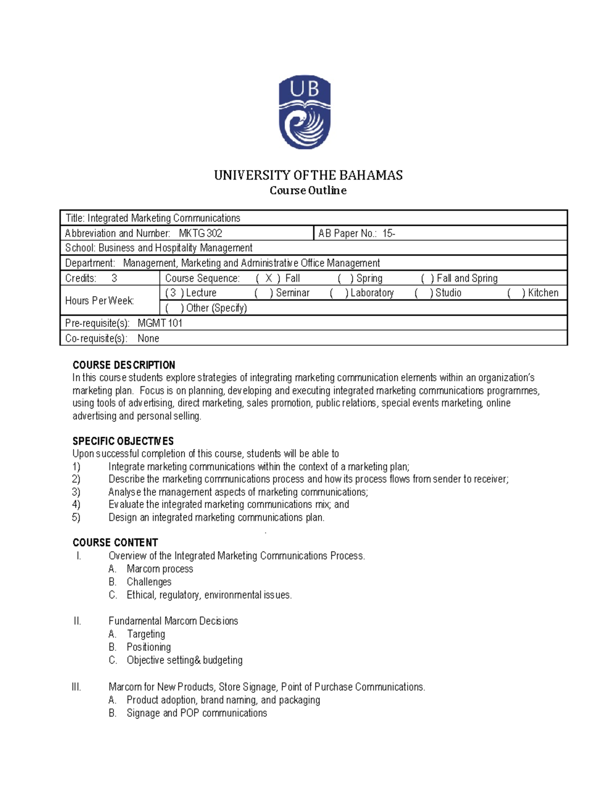 Course Outline MKTG 302 UNIVERSITY OFTHE BAHAMAS Course Outline