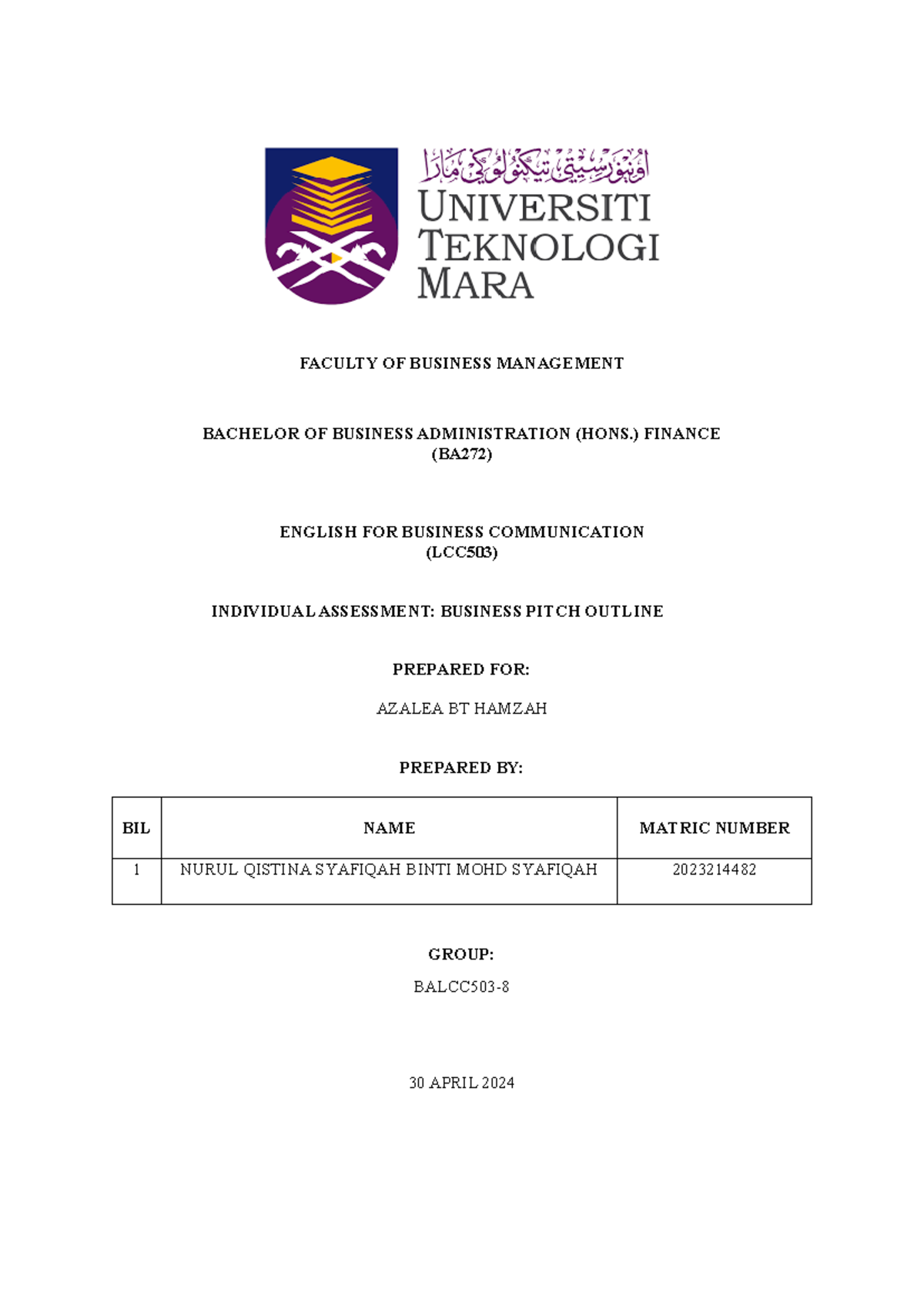 Business Pitch Outline 2 FACULTY OF BUSINESS MANAGEMENT BACHELOR OF