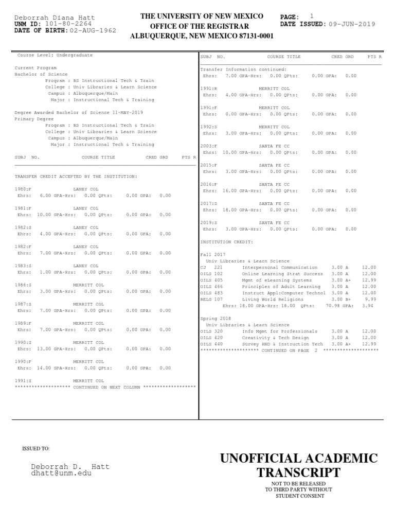 Unm Final Transcript 2019 PDF Bachelor's Degree Educational Stages