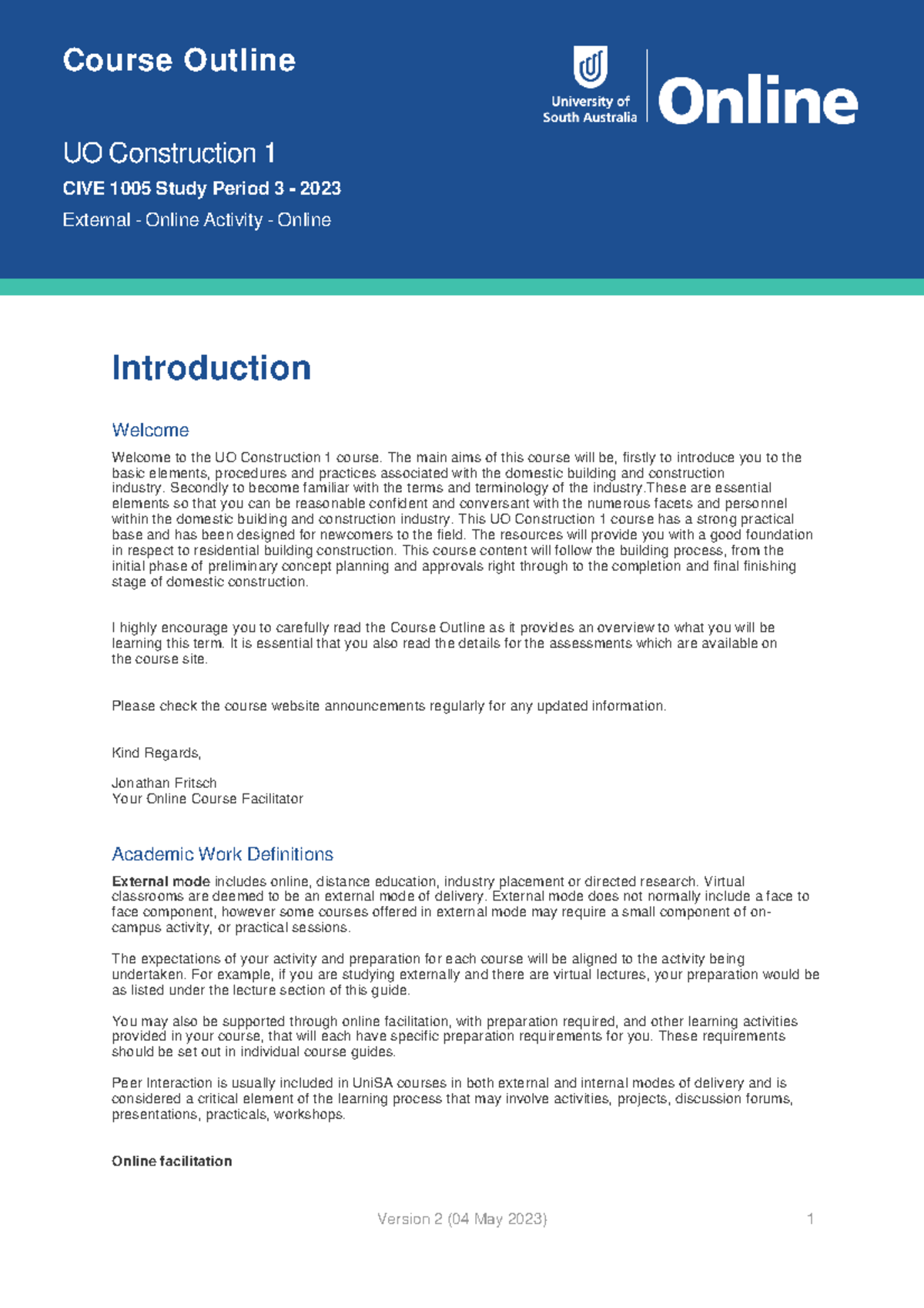 Course Outline (10) Course Outline UO Construction 1 CIVE 1005 Study