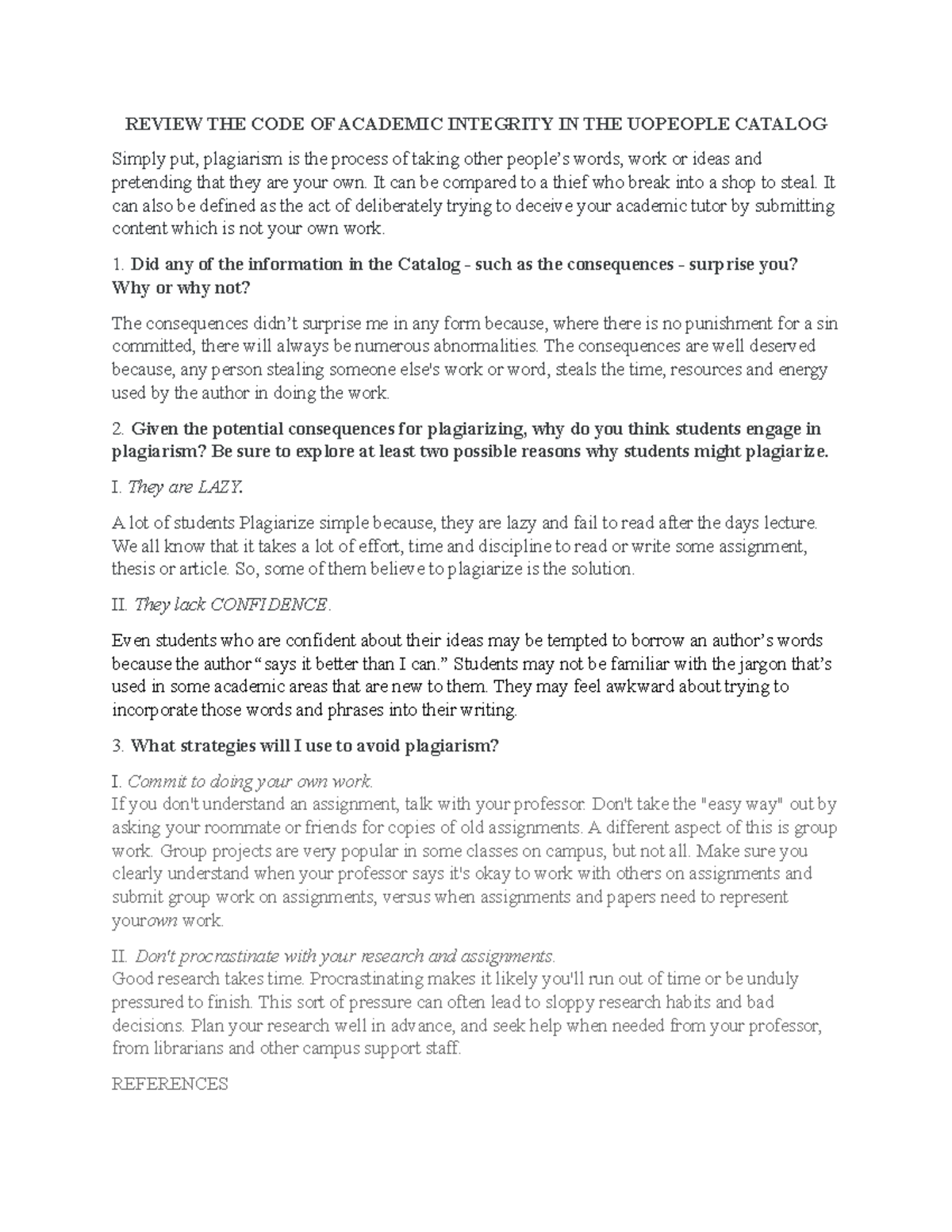 Plagiarism REVIEW THE CODE OF ACADEMIC INTEGRITY IN THE