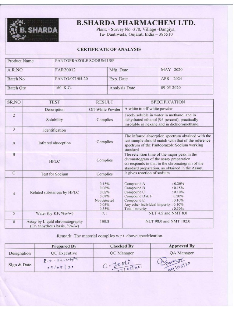 PANTOPRAZOLE USP coa