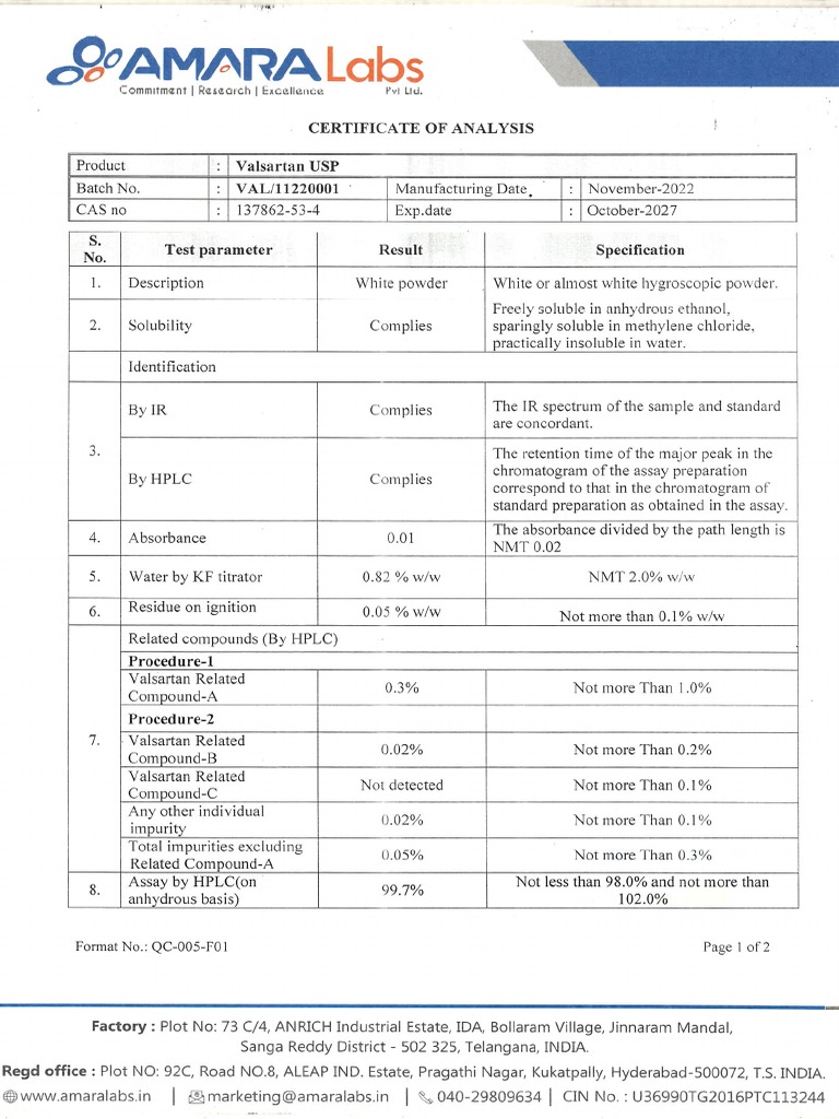 Valsartan UspCoa PDF