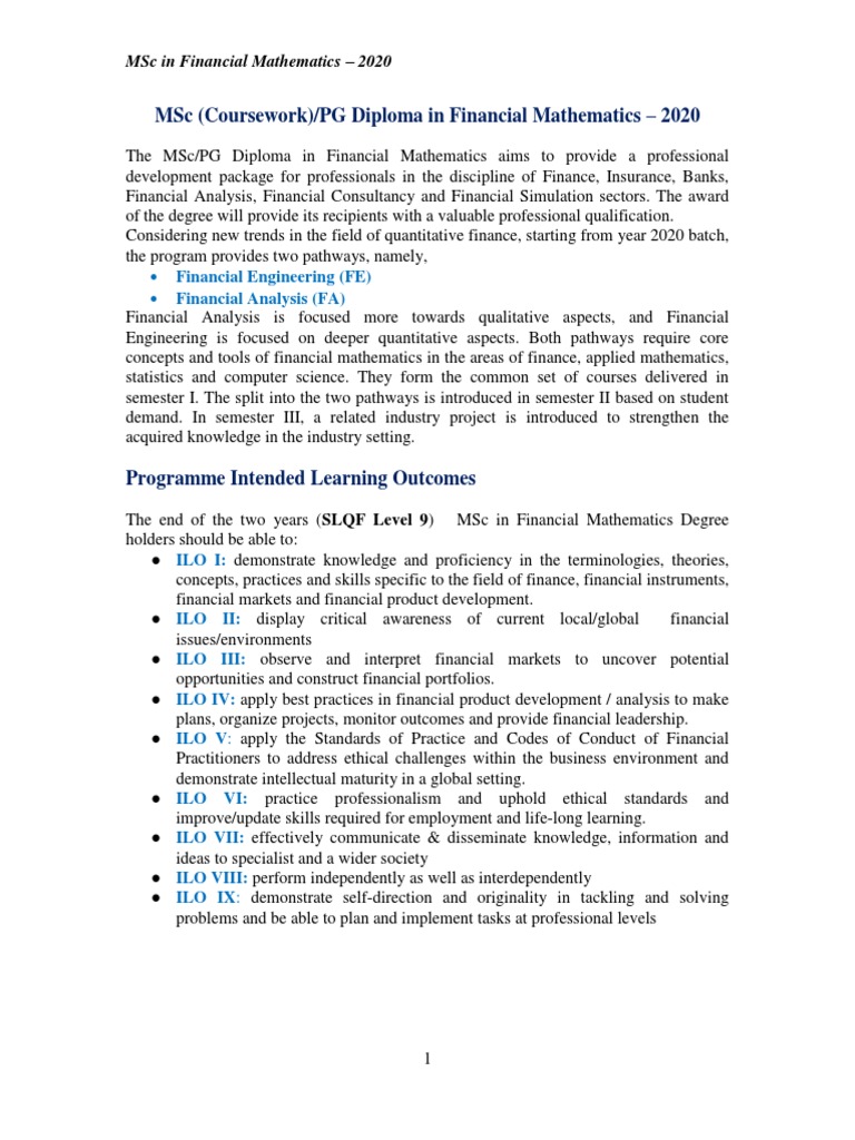 MSC in Financial Mathematics Course Catalog PDF Option (Finance