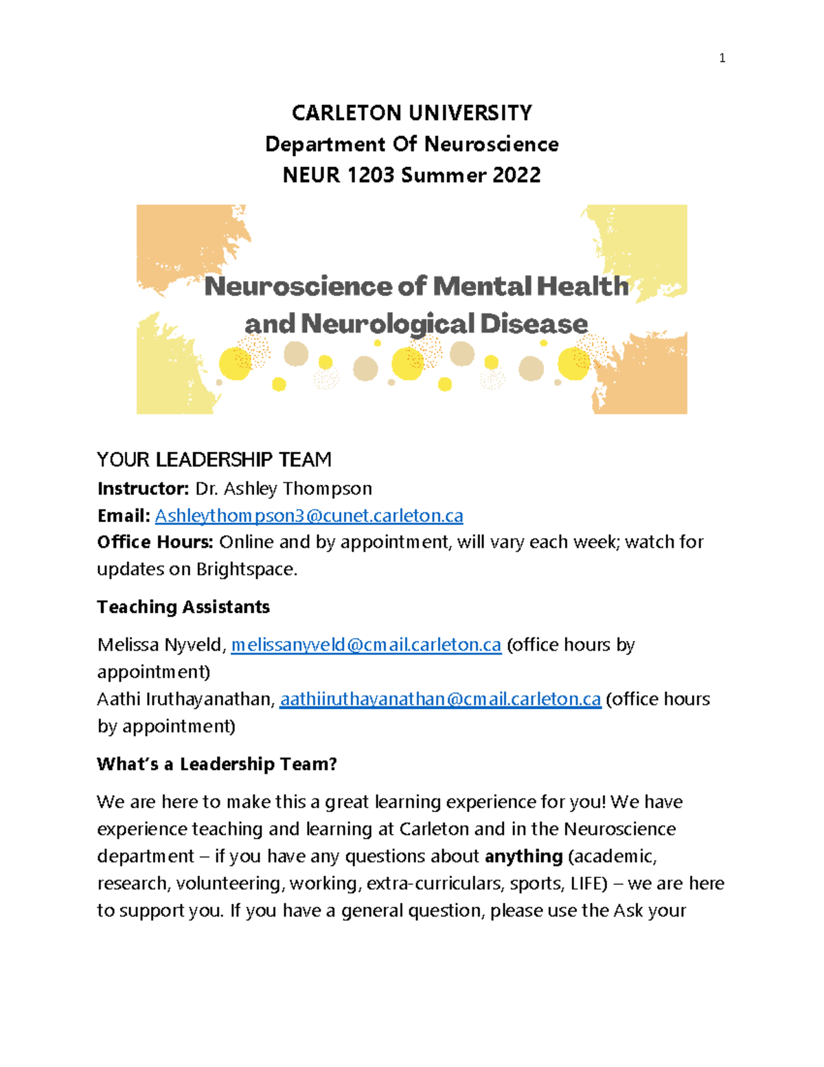 Course Outline NEUR1203A Summer 2022 CARLETON UNIVERSITY Department