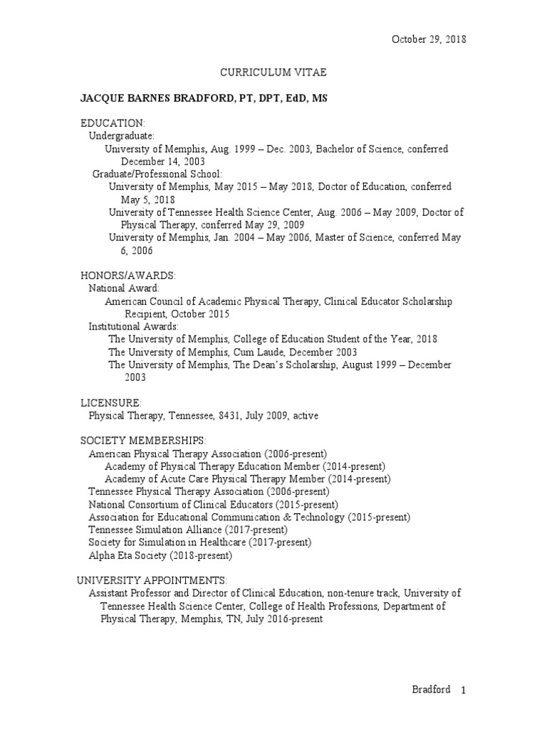 Uthsc Curriculum Vita Updated 10 18 PDF Physical Therapy