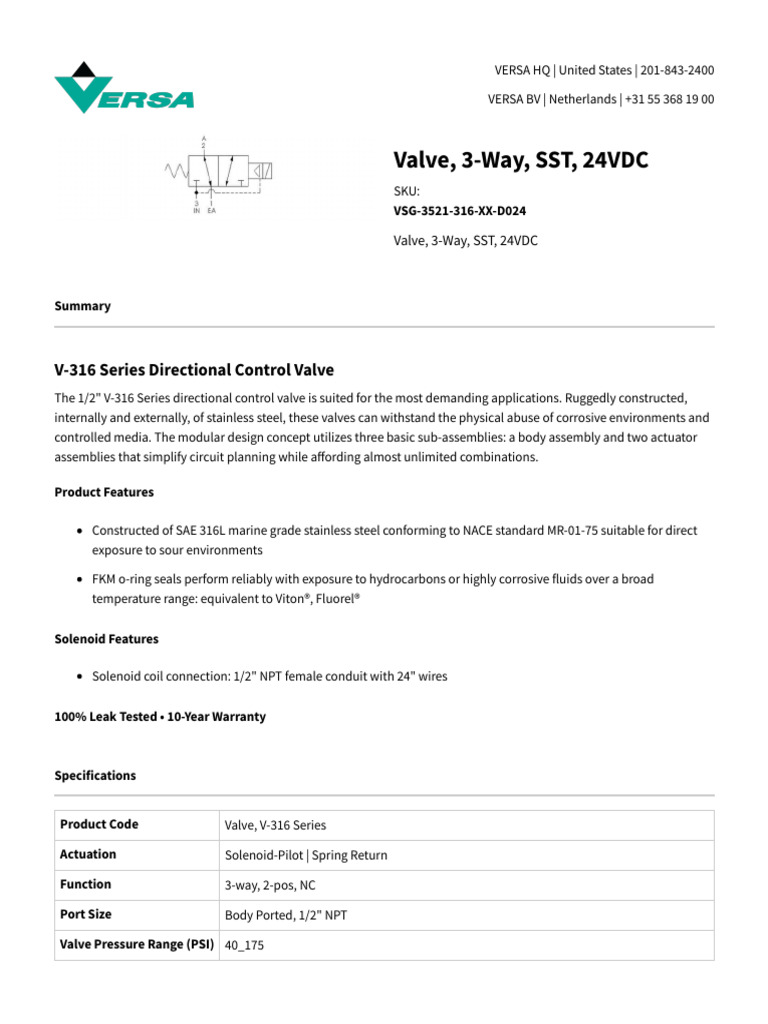 VERSA Valve, 3Way, SST, 24VDC PDF Valve Equipment