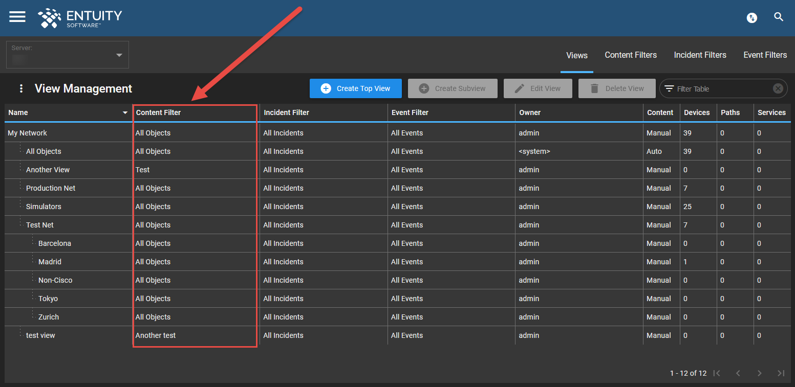 How do I manage View content filters? Entuity