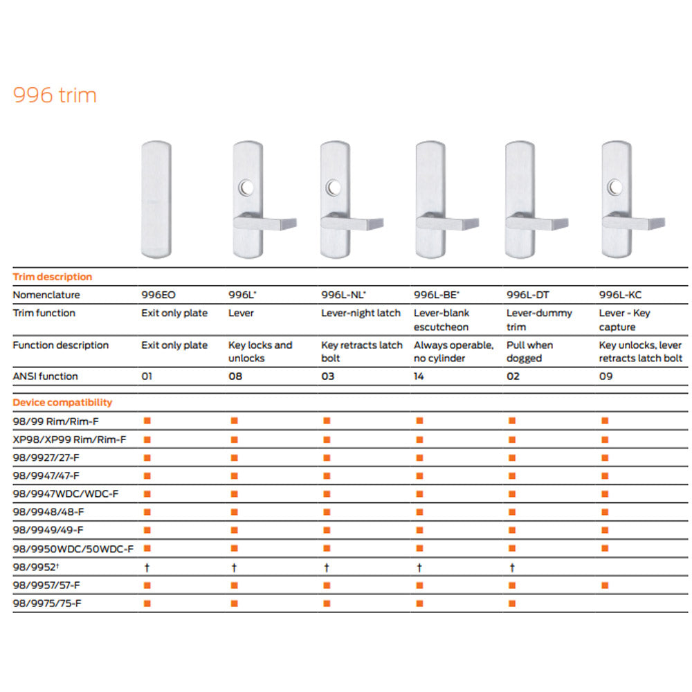 Von Duprin 996LM Lever Trim for Mortise Lock 98/99 Series Exit