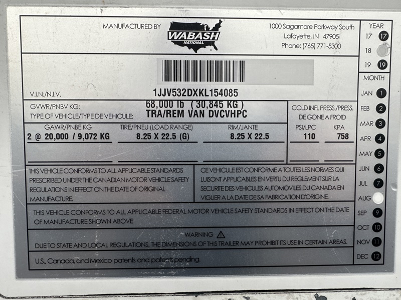 2020 Wabash 53 ft Dry Van Trailer Swing Door, Air Ride, Sliding Axle