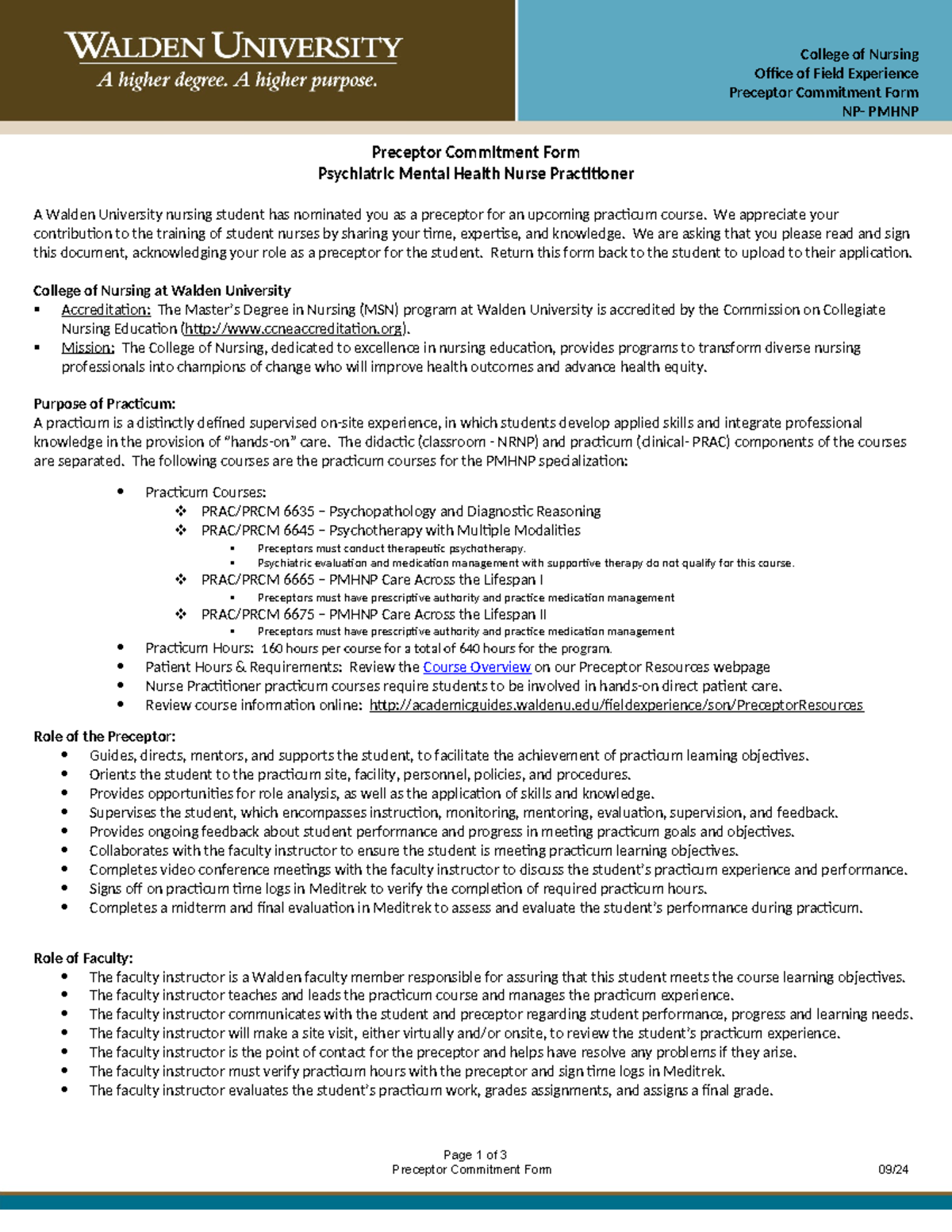 Preceptor Commitment Form for PMHNP Practicum at Walden University