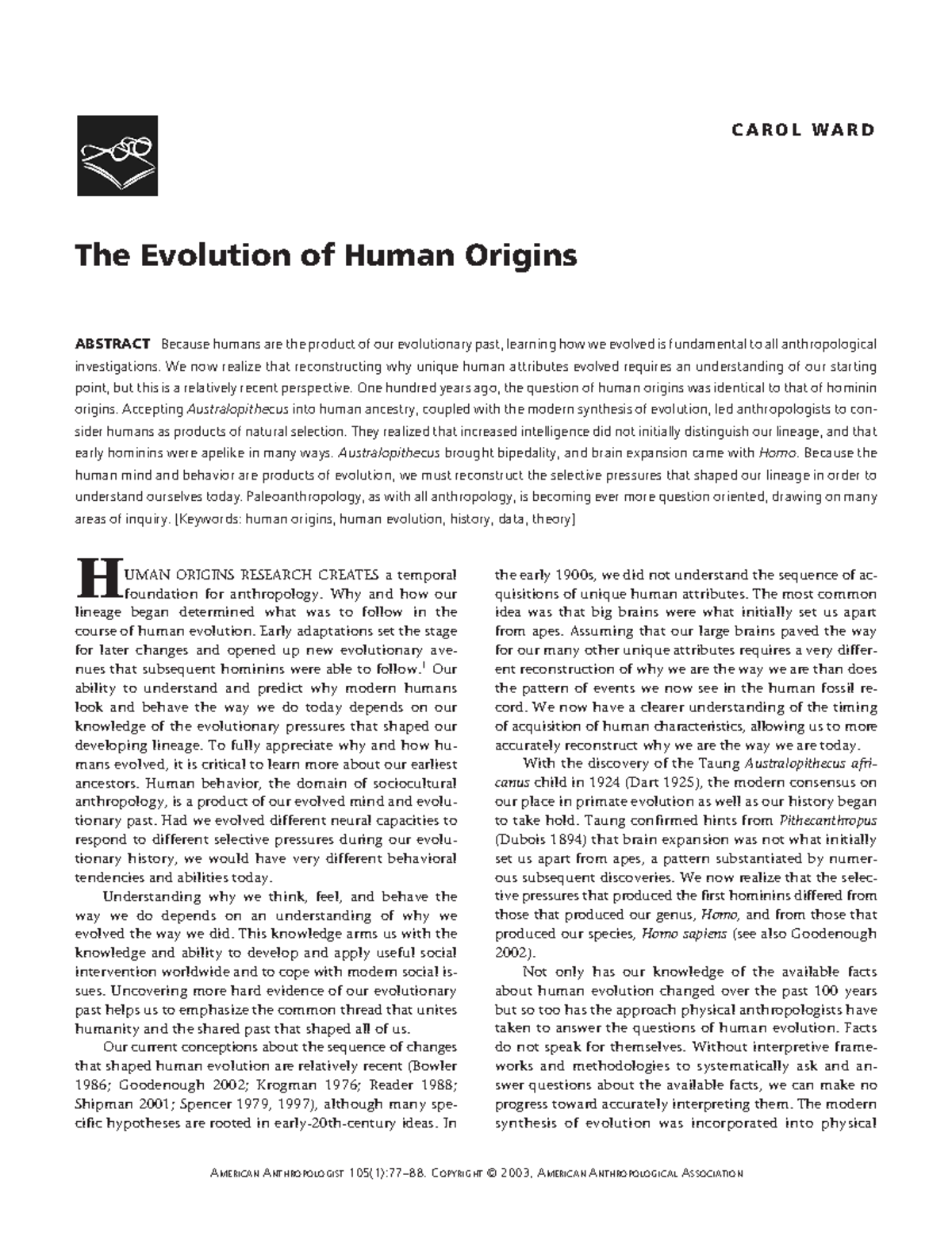 AA 2003 1051 7788 The Evolution of Human Origins Ward CAROL WARD