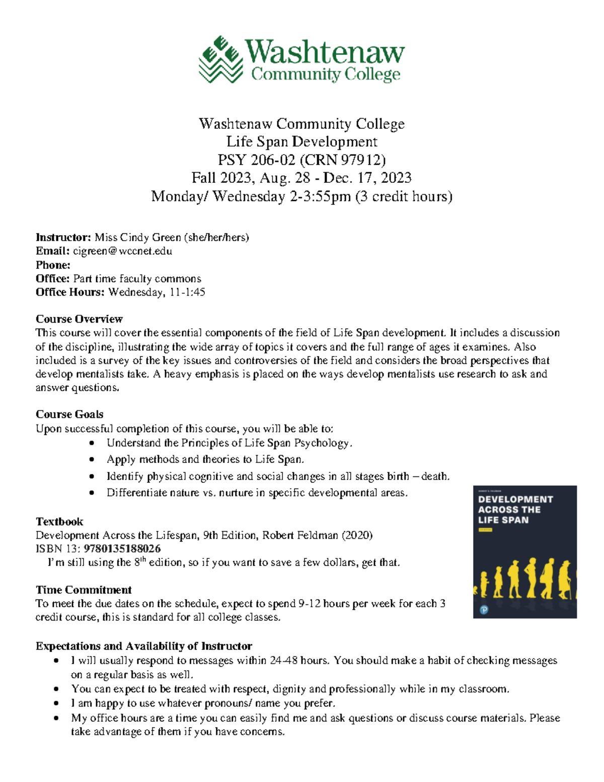 PSY206 Syllabus F2023 Washtenaw Community College Life Span