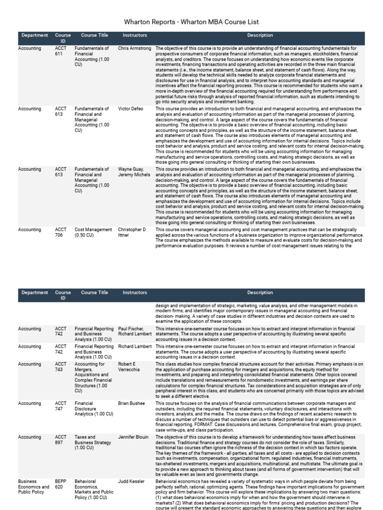 Wharton Reports Wharton Mba Course List PDF Accounting Economics