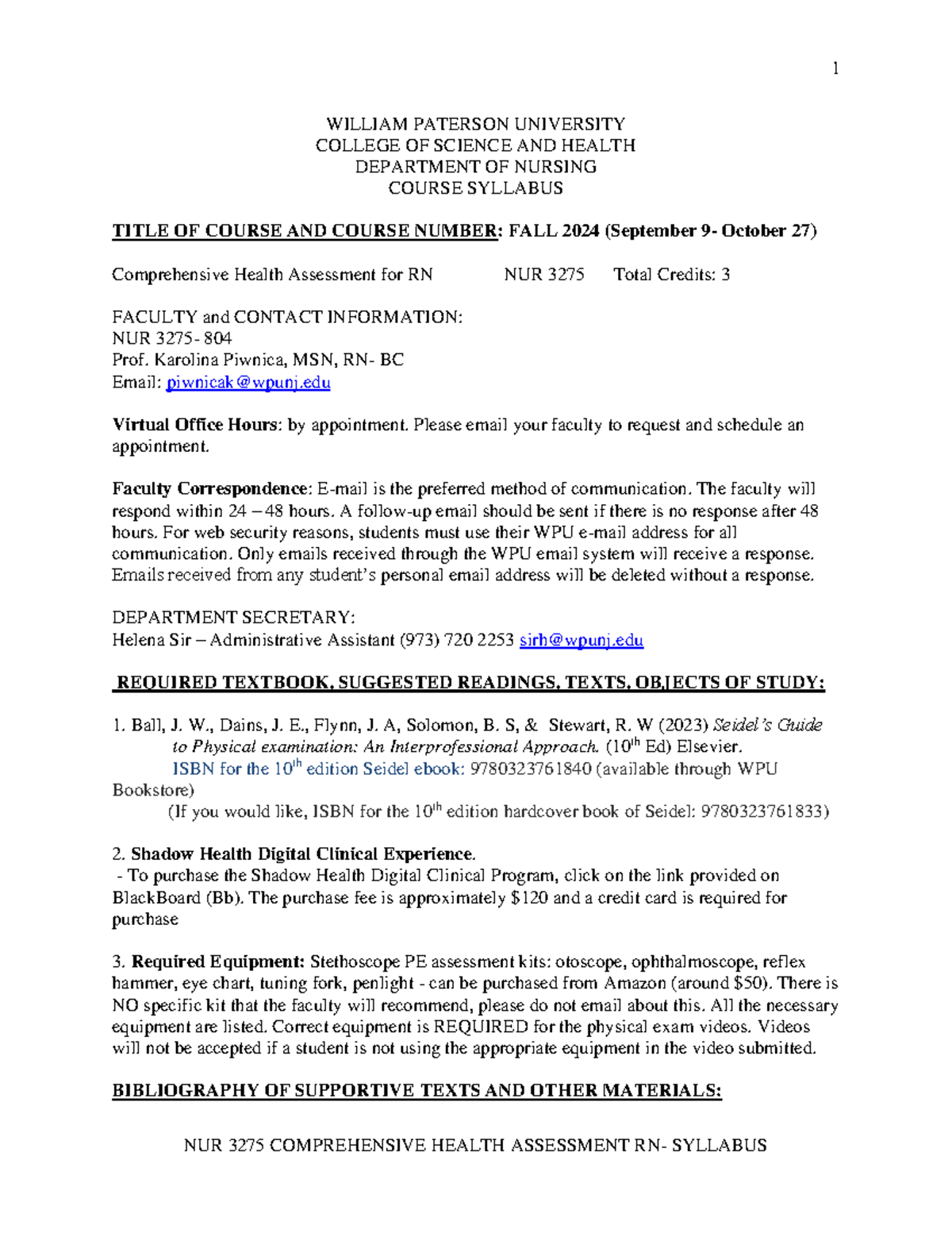 NUR 3275 Course Syllabus Fall 24 WILLIAM PATERSON UNIVERSITY COLLEGE
