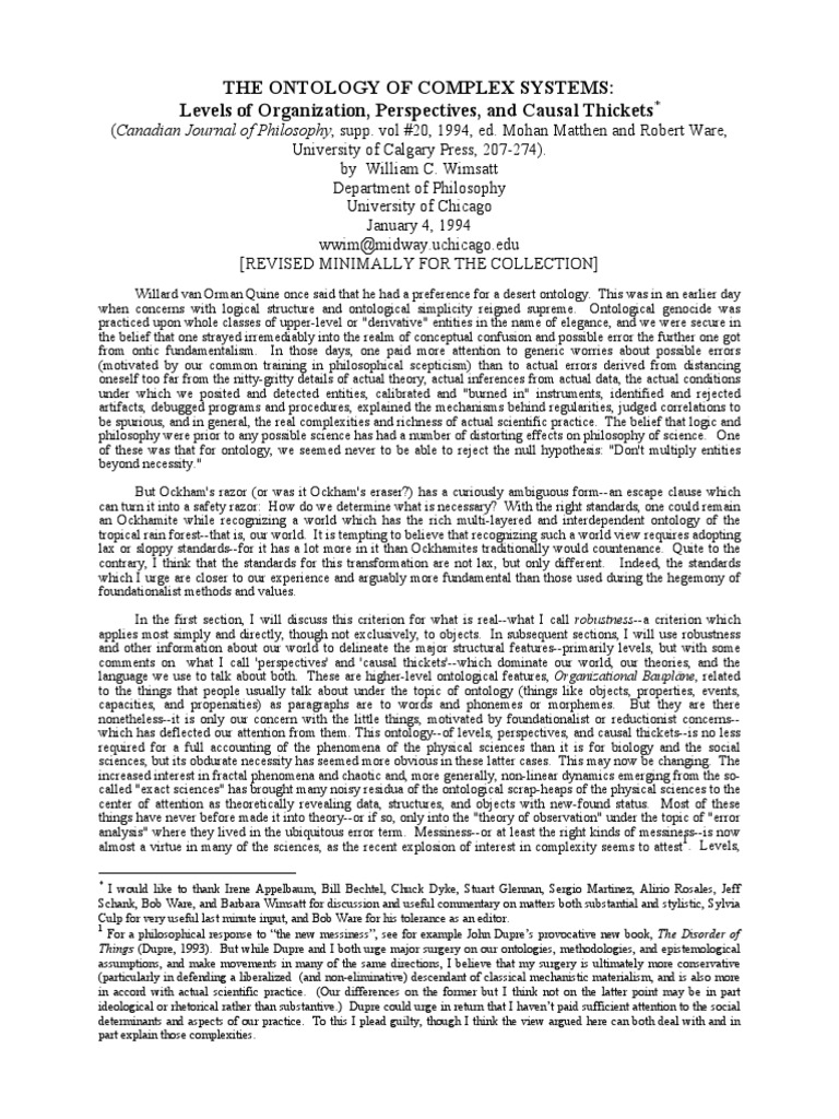 Wimsatt 94 The Ontology of Complex Systems PDF Reductionism