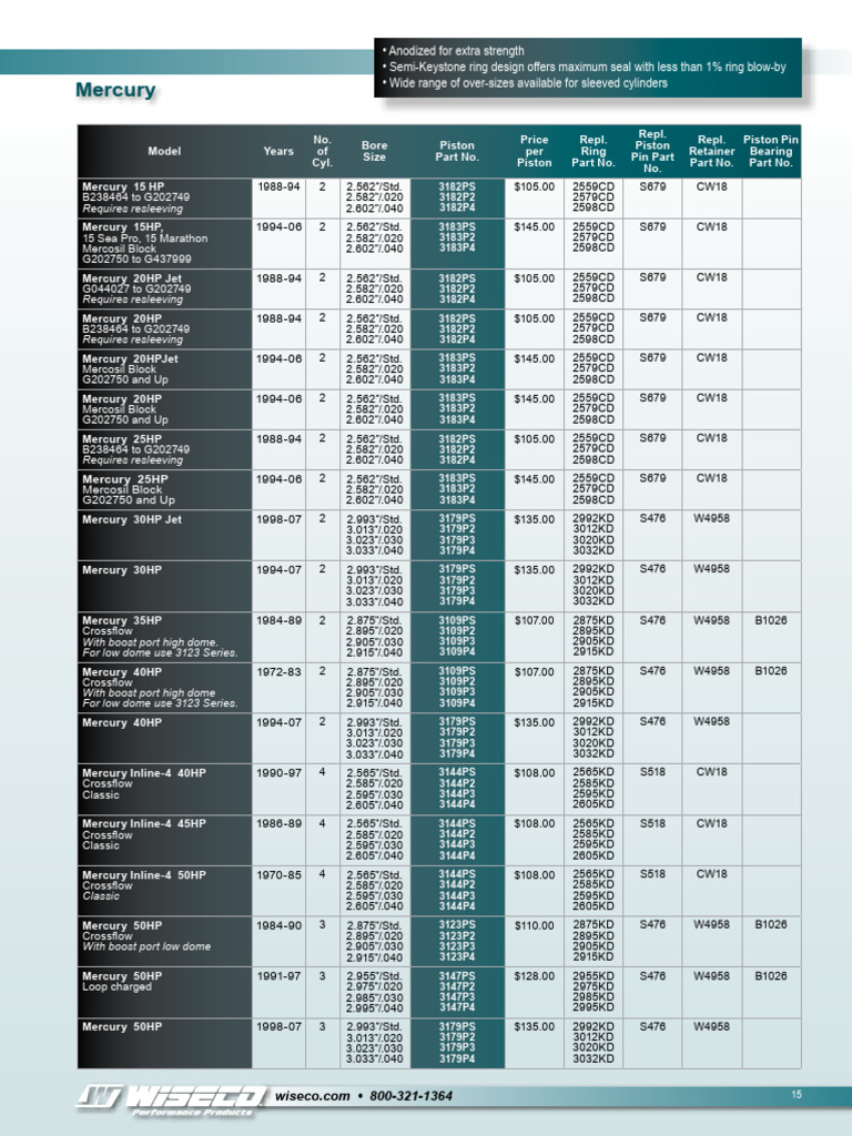 WISECO Piston Catalogue Mercury PDF Piston Cylinder (Engine)
