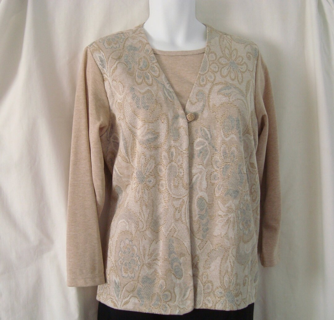 Vintage Women's BONWORTH Beige & Blue W Gold Metallic LS Dressy Knit