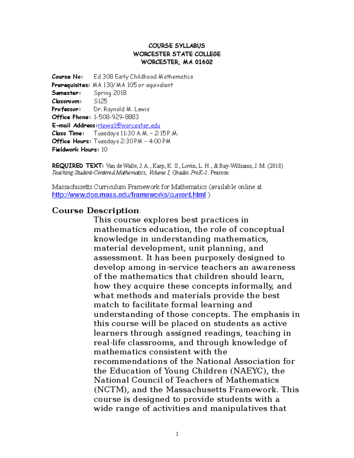 ED 308 Course Syllabus Spring 2019 COURSE SYLLABUS WORCESTER STATE