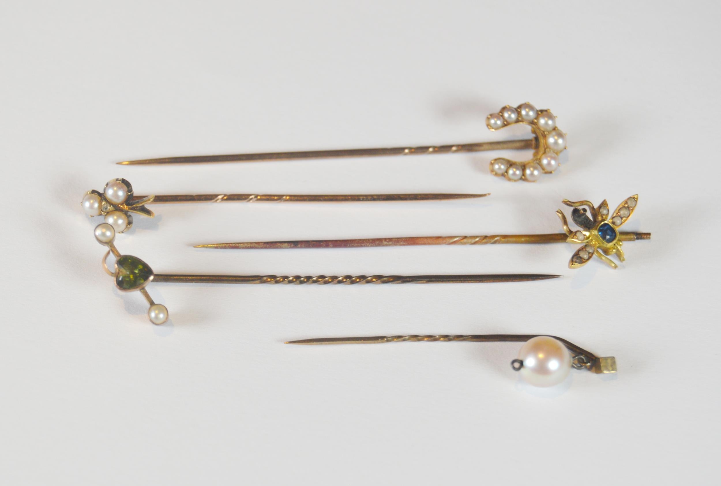 Five stick pins, three set with pearls, one baroquestyle, trefoil