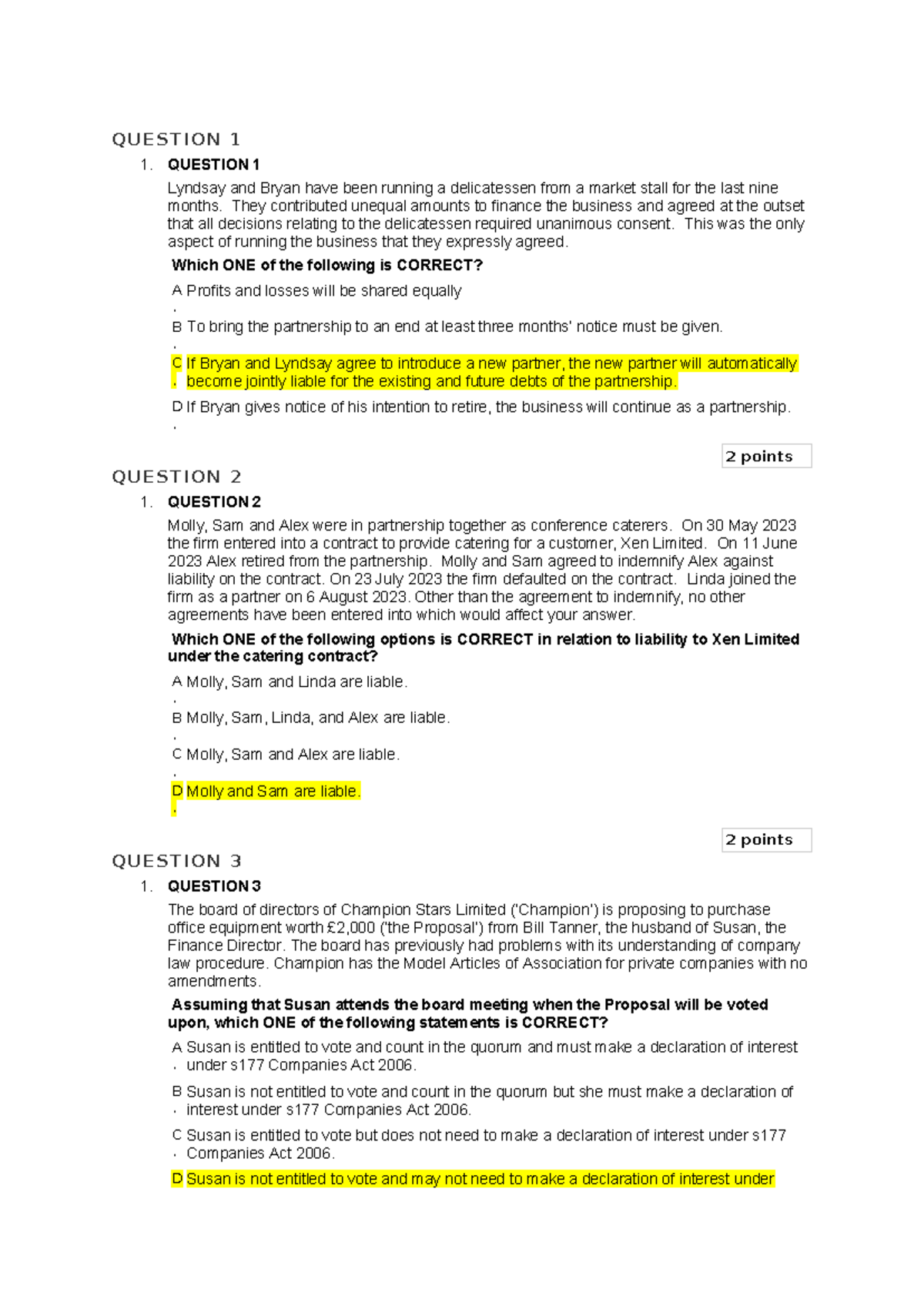 BLP MCQ'S my Mock answers Q U E S T I O N 1 1. QUESTION 1 Lyndsay and
