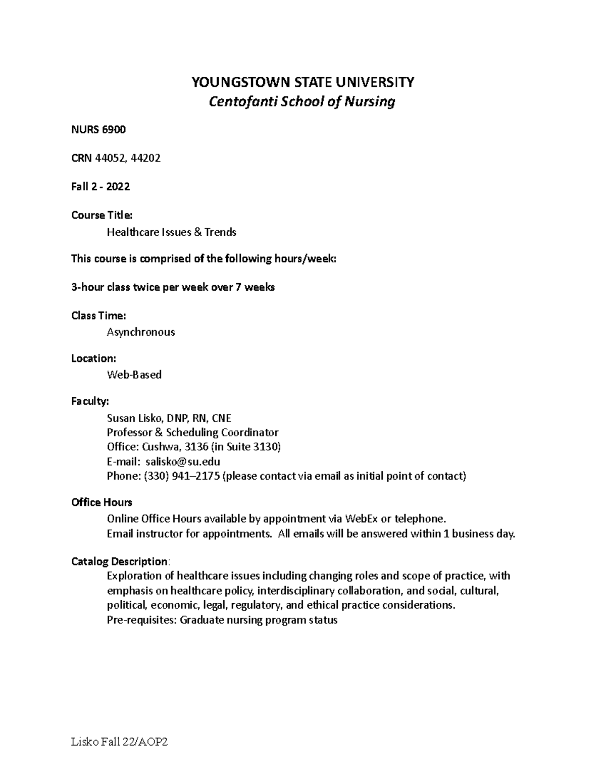 Syllabus n/a YOUNGSTOWN STATE UNIVERSITY Centofanti School of