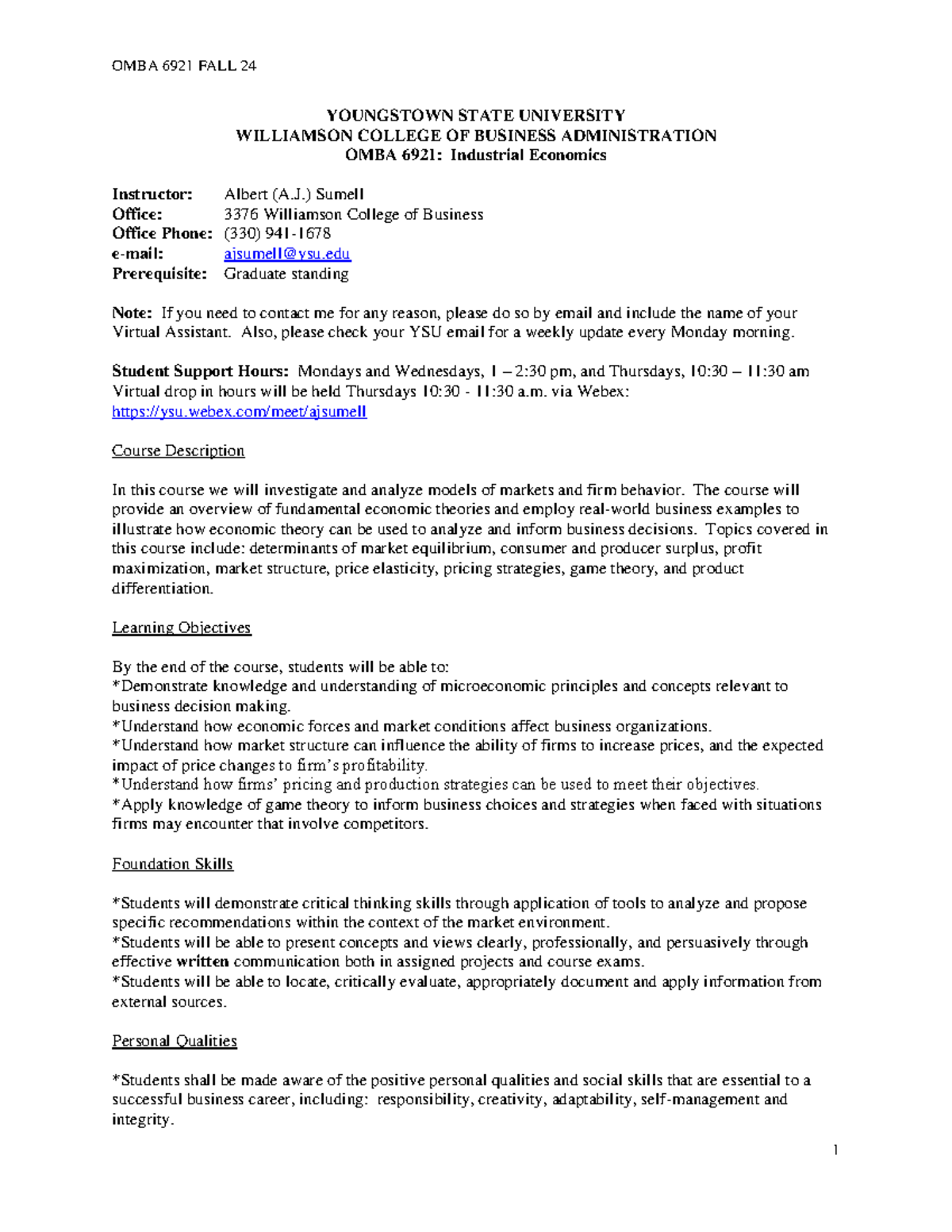 OMBA 6921 Syllabus YOUNGSTOWN STATE UNIVERSITY WILLIAMSON COLLEGE OF
